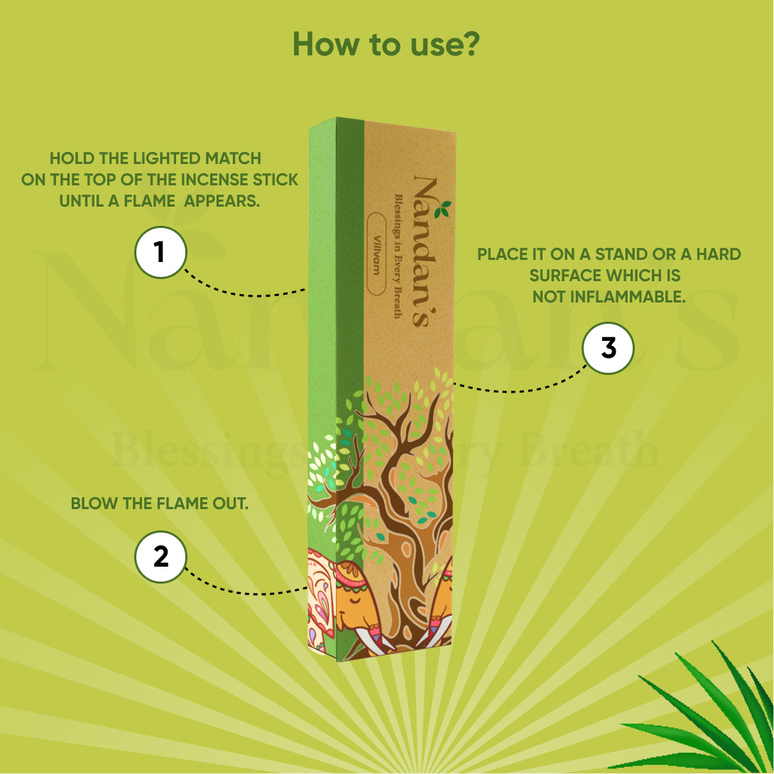 At Nandans, we honor the ancient traditions and sacred wisdom passed down through generations. Each Vilvam Incense Stick is crafted with utmost care and reverence, using ethically sourced ingredients to ensure the highest quality and authenticity.